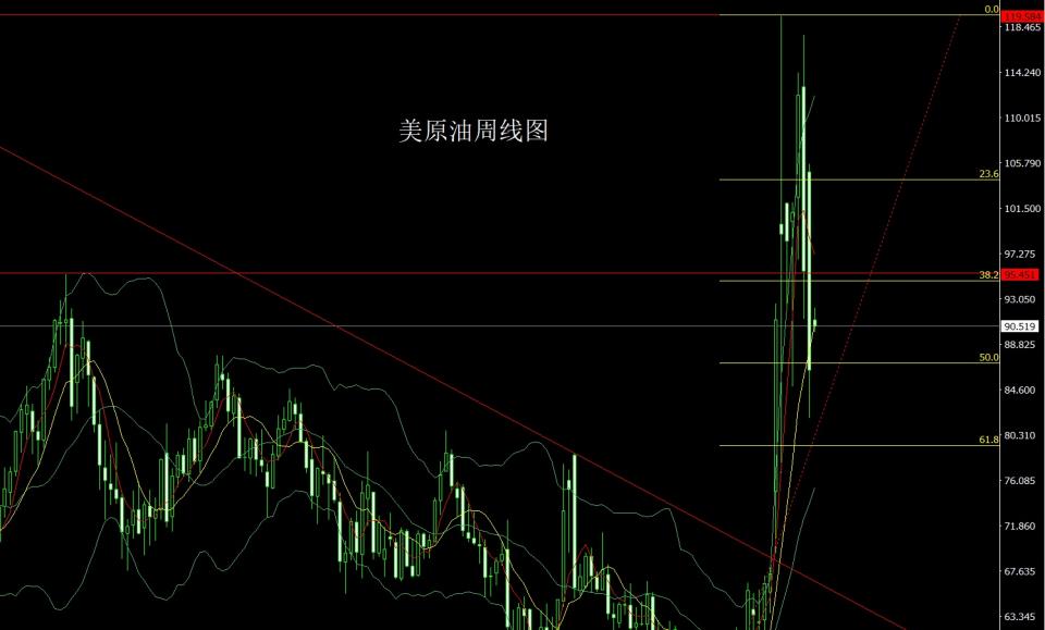 美原油市场上周高开在104.883的位置后行情小幅拉升给出105.624的位置后行情强势回落,周线最低给到了81.812的位置后整理,周线最终收线在了86.32的位置后,周线以一根下影线很长的超级大阴线收线,而这样的形态收尾后,本周94空止损94.5,目标看90和88和87和85.