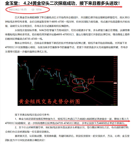 本人金玉堂--从事金融分析师行业已经十余年,主要从事关于黄金,白银,原油等交易思路分析,每天我都是真心为每一位投资朋友提供相关建议和详细交易趋势思路分析,望大家可以多关注,有任何想法或问题可以随时与我联系,有需要可首先添加本人QQ:1683134128;或者关注公众号或搜索微博:金玉堂讲金-主讲黄金;也可添加钉钉号:jyt5188,最后也可以添加本人微信:jyt248888