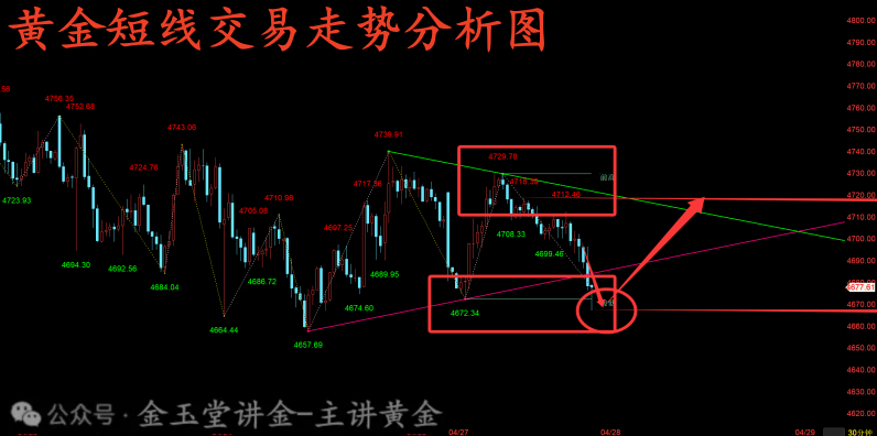 2、金价如果再次承压上方压制后开始走跌,那么我们下方再次做多的首要点位可以暂时考虑放在下方4690-4700附近,而在行情没有较大的单边波动的时候,我们白天暂时就还是继续关注4690-4740小区间来回把握为主就行。