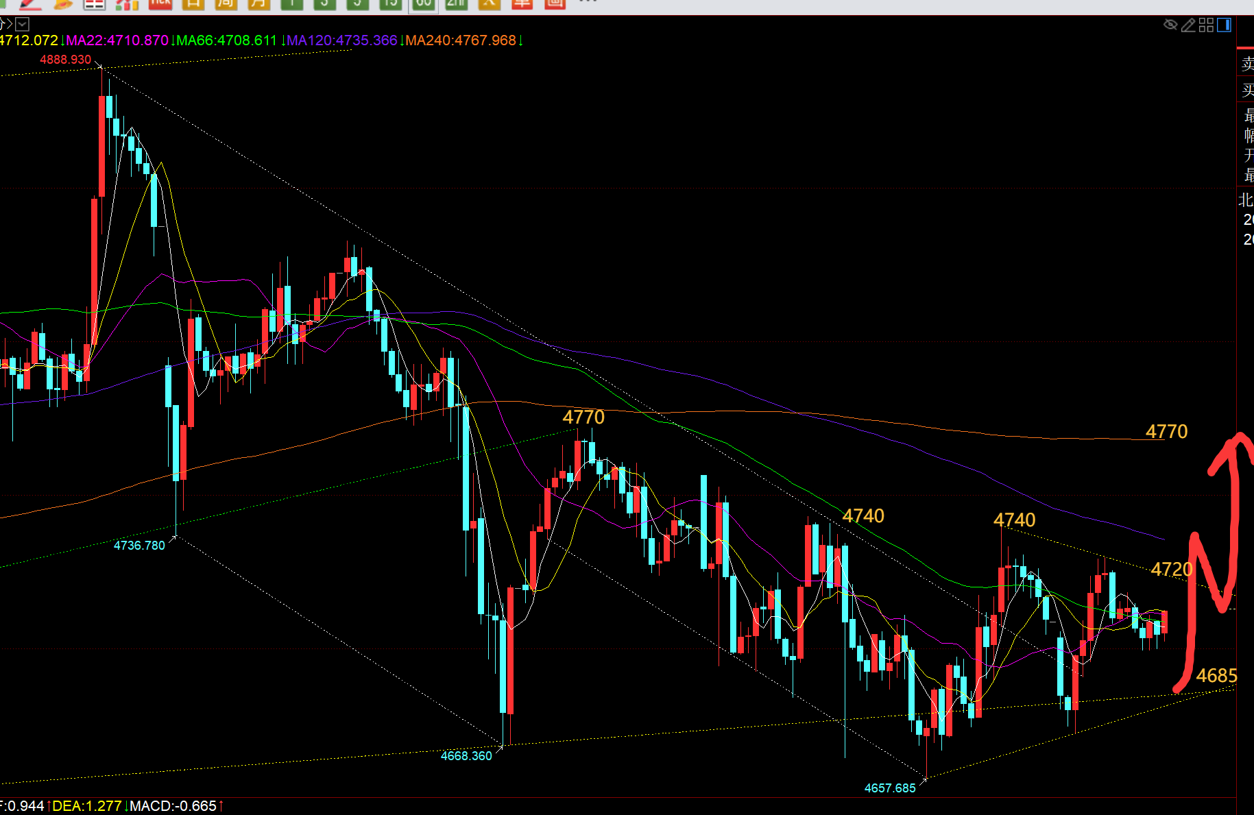 第二,黄金小时线级别:本周一开盘之后的走势又循环了前两周的周一走法,先跳空低开,然后探底拉升V反补破高,之后陷入震荡整理;所以,一早起的晚,也就基本踏空低位,后续就没什么好位置;从图中通道分布看,上周白色下行通道已经突破,从弱势震荡逐步偏中性整理,4668仍多次支撑稳固,上方阻力也明显4740、4770都是关键双顶或多重顶,只有突破年均线4770站上,才能从中性整理转为强势震荡上行; 当前是黄色小收敛整理,小阻力4720一线,支撑4685一线,今晚靠近支撑或阻力择机把握震荡即可,见好就收,没太大的延续性;