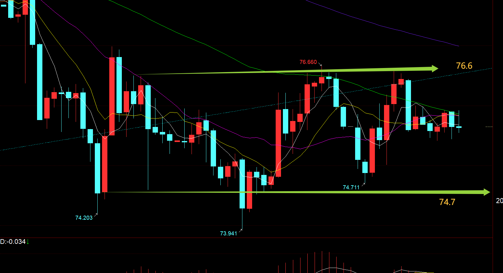 白银方面:日线也是每次收盘卡在中轨徘徊,10日阻力是77.8,哪天突破站上它,则回归至前期通道之内,短期就会转震荡强势上攻;而若震荡延续走弱,下方重点留意70-71,周视频指出的另一个通道下轨,稳住依然会逐步上行;今晚它震荡范围先参考图中的76.6-74.7;