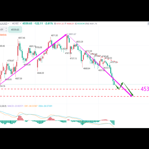 目前下方重点考验4600整数关口,这也是短线多头最后的关键防守防线,一旦失守,下行空间将进一步放大。晚间操作上,顺势高空为主。若金价先行反弹至4636-4638区间,可择机布局空单,止损统一设置在4650上方,短线目标下看4580-4550区域,顺势把握空头主节奏。